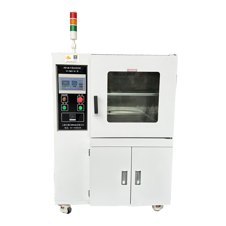 设备为PLC工控全自动运行,通过高温烘烤基片,去除其表面的水分,充入HMDS(六甲基二硅氮烷C6H19NSi2)气体,在高温作用下,基片表面和HMDS充分融合反应,生成以硅氧烷为主体的化合物,使基片表面由亲水变为疏水,其疏水基可很好地与光刻胶结合,起着偶联剂的作用;